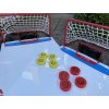 - Korong a kis hálóban - 3 pont. Korong a nagy kapuba - 1 pont. Ez egy 21 pontos játék, de vigyázat, ha a korong a palánkok elé pattan, a másik csapat védekezhet és blokkolhatja a korongot.
