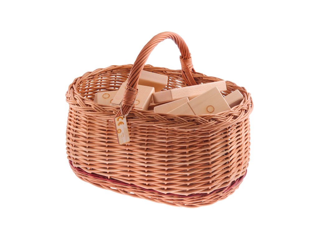 - 28 drewnianych kostek do gry, wiklinowy koszyk do łatwego przenoszenia kostek.