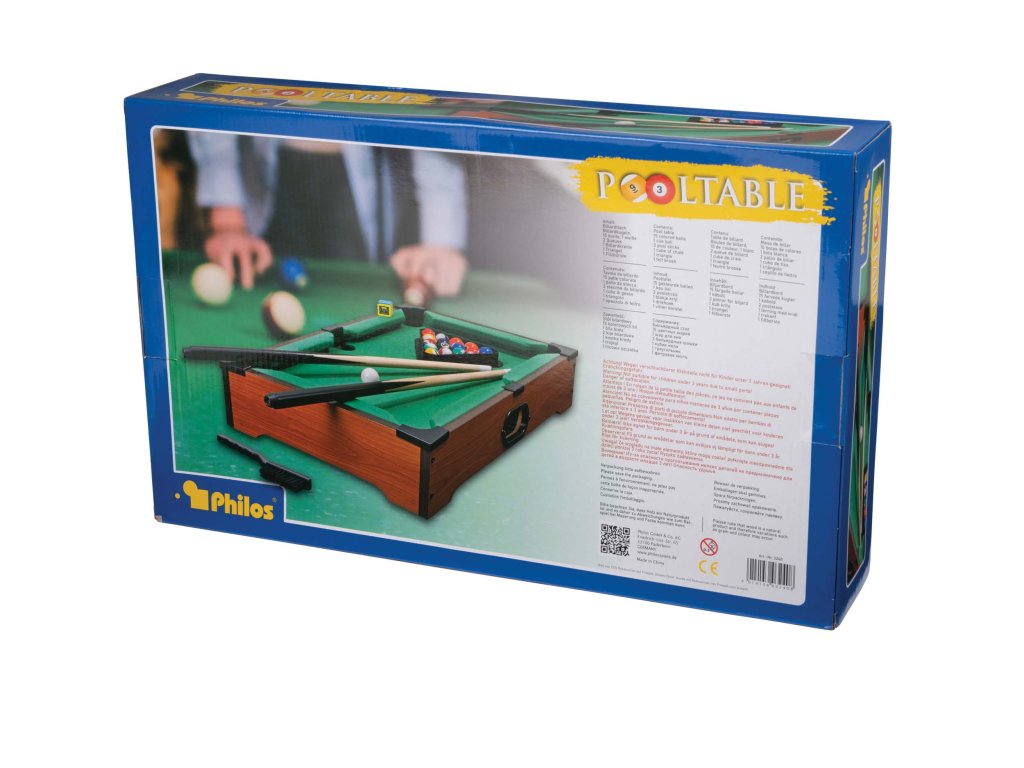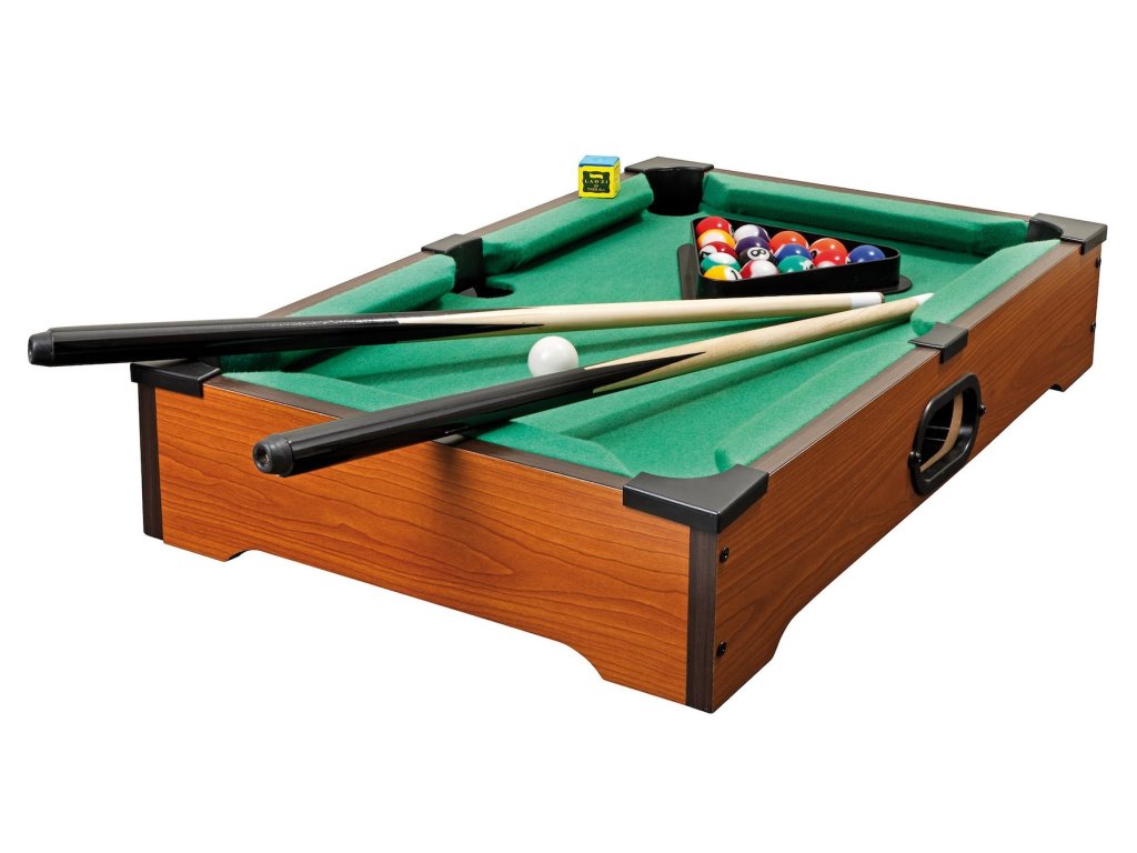 Mini stół bilardowy z drewnianymi kijami i małymi kulami. Świetna zabawa w domu na stole lub dywanie.