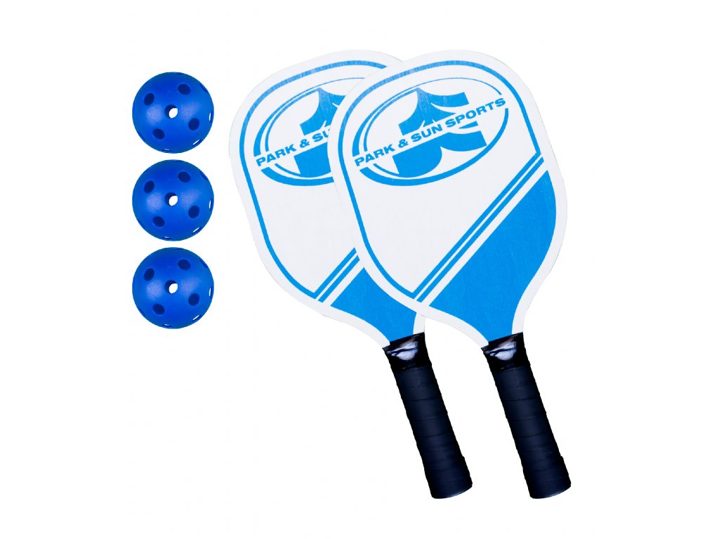 Pickleball - zestaw: 2 drewniane rakiety z wygodnym uchwytem, trzy piłki, regulowana siatka i torba do przechowywania.