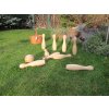 - 10 fa bábu (bábuk magassága 30 cm), fa játéklabda (Φ 12 cm). Ez a változat lánc és fűzőlyukak nélkül készült.